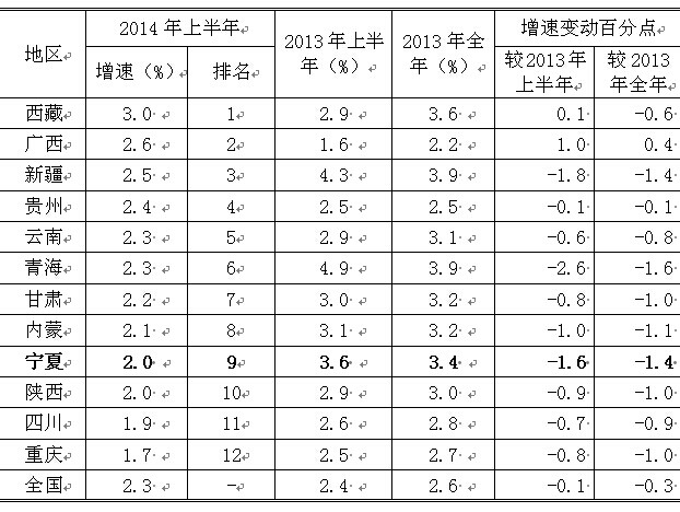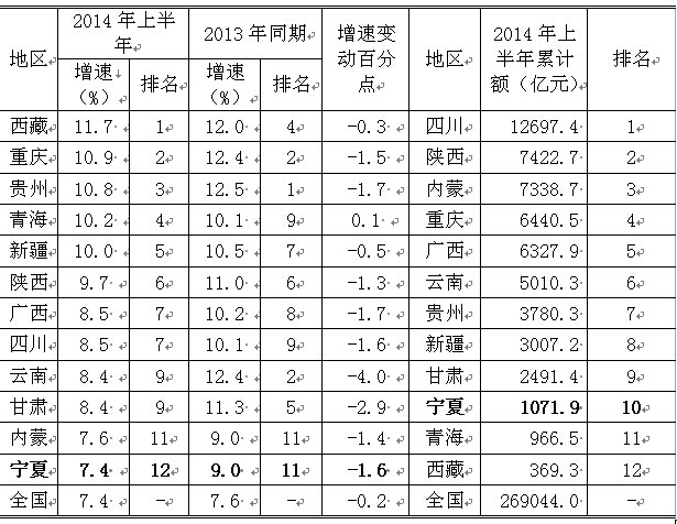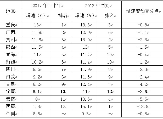 2014年上半年,我国经济仍面临较大的下行压力,西部地区各项经济指标延续了上年以来的低位增长态势,各项主要经济指标对比如下:
