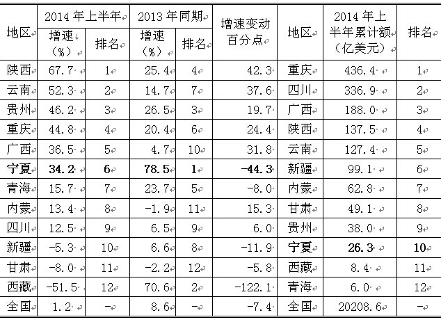 2014年上半年西部地区进出口总额对比表