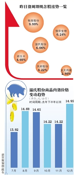 值得注意的是,受猪肉价格上涨影响,昨日沪深两市的“猪肉概念股”中,多数公司股价上涨,其中牧原股份股价涨停,傲农生物、温氏股份的股价分别上涨6.24%、6.06%。